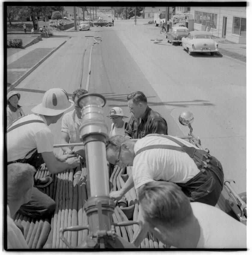 Negative, sheet film. 2.25 x 2.25 b&w. No. 306. Tumwater Fire Department at practice. No ID on people.