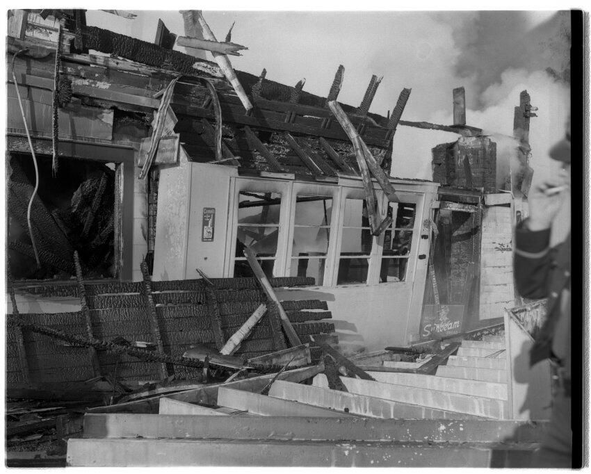 Negative, sheet film. 4 x 5 b&w. No. 306. Tumwater Fire Department at fire, probably when Tumwater Bowl building burned December 30, 1955. Building was originally called the Tumwater Club, built as recreational facility for Olympia Brewery workers. Located on Capitol Boulevard near intersection of that street with Custer Way.Name/Title