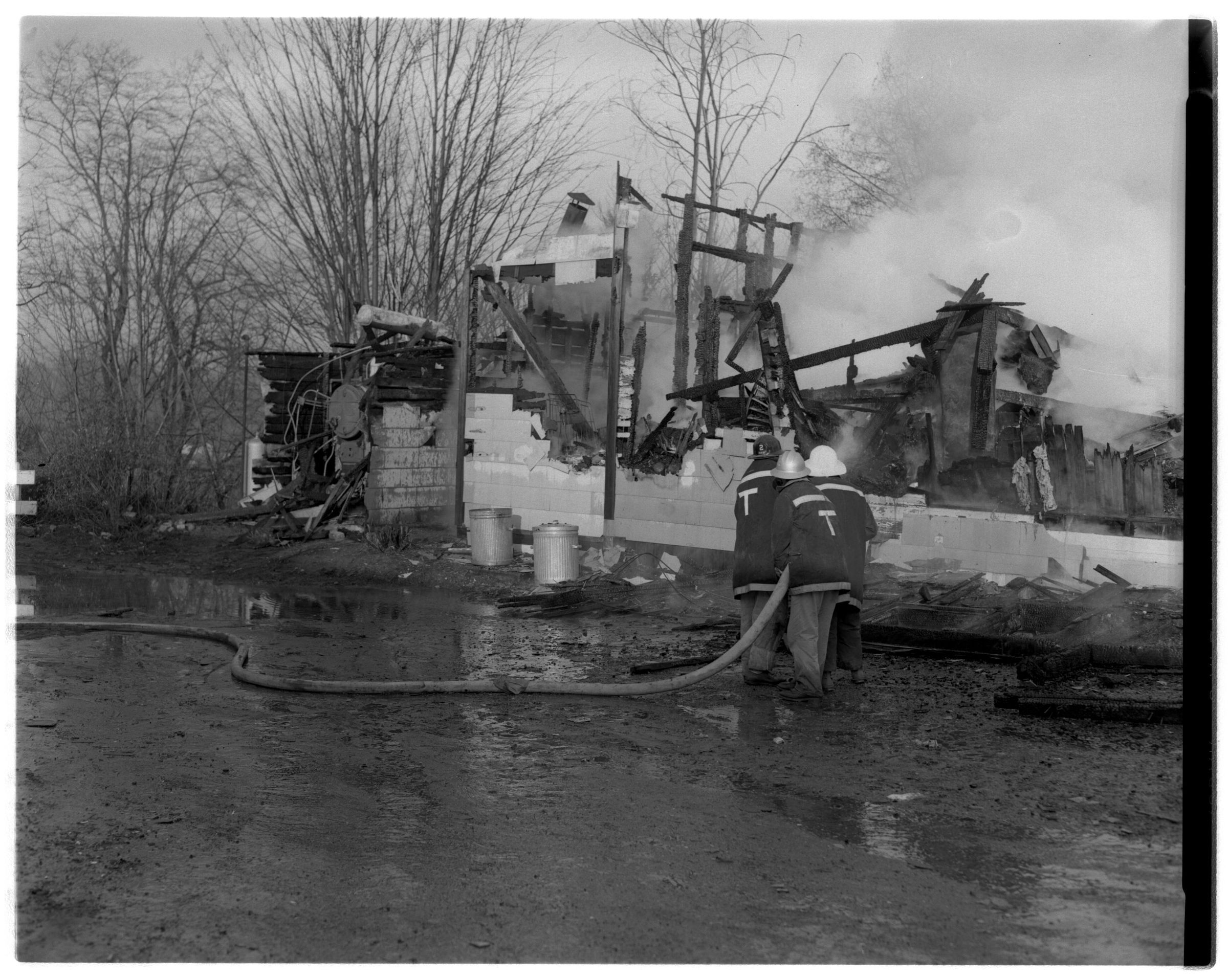 Negative, sheet film. 4 x 5 b&w. No. 306. Tumwater Fire Department at fire, probably when Tumwater Bowl building burned December 30, 1955. Building was originally called the Tumwater Club, built as recreational facility for Olympia Brewery workers. Located on Capitol Boulevard near intersection of that street with Custer Way.Name/Title