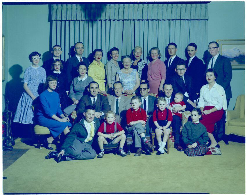 Negative, sheet film. 4 x 5 color. No. M763. Mrs. Adolph Schmidt. Christmas group. Made 1958. 11/08/1968. Schmidt family gathered for Christmas 1958. Unknown location, possibly home of Winifred Schmidt. Left to right: