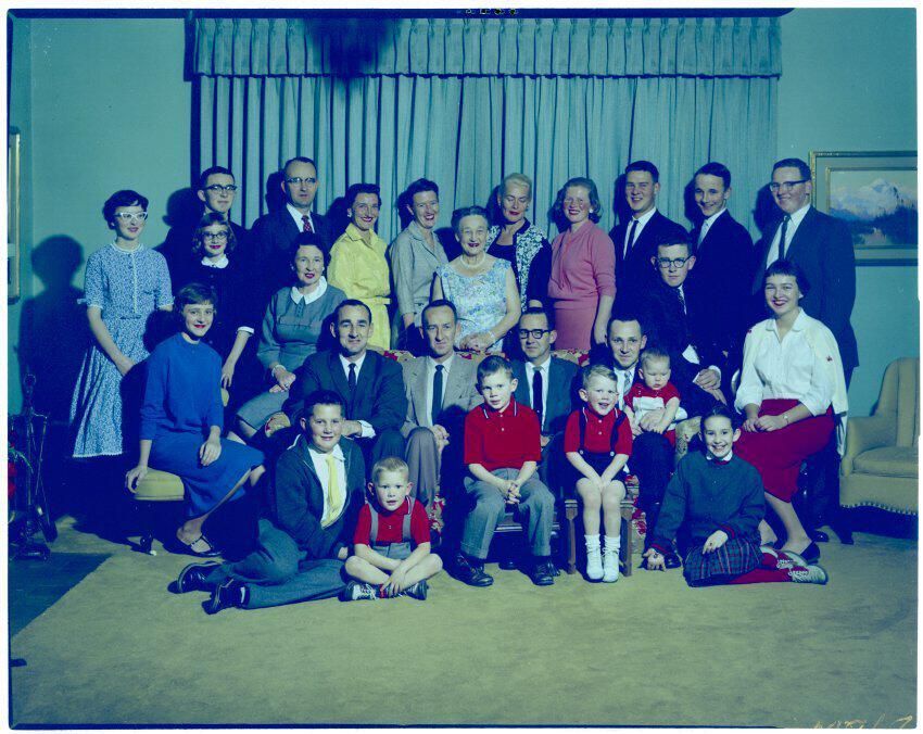 Negative, sheet film. 4 x 5 color. No. M763. Mrs. Adolph Schmidt. Christmas group. Made 1958. 11/08/1968. Schmidt family gathered for Christmas 1958. Unknown location, possibly home of Winifred Schmidt. Left to right: