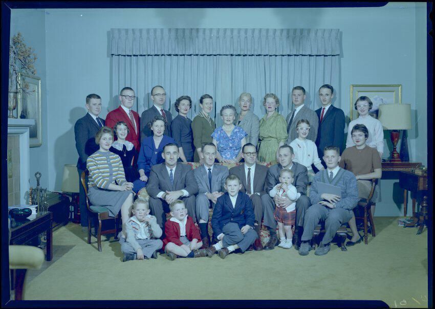 Negative, sheet film. 5 x 7 color. No. 01. Mrs. Adolph Schmidt. Christmas group - color. Ordered 01/02/1960.