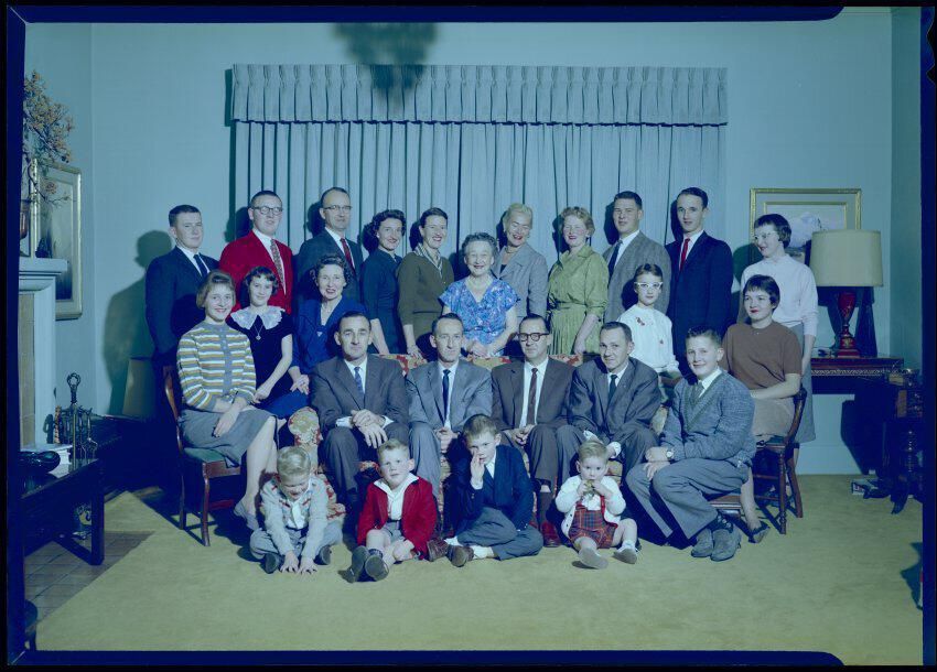 Negative, sheet film. 5 x 7 color. No. 01. Mrs. Adolph Schmidt. Christmas group - color. Ordered 01/02/1960.