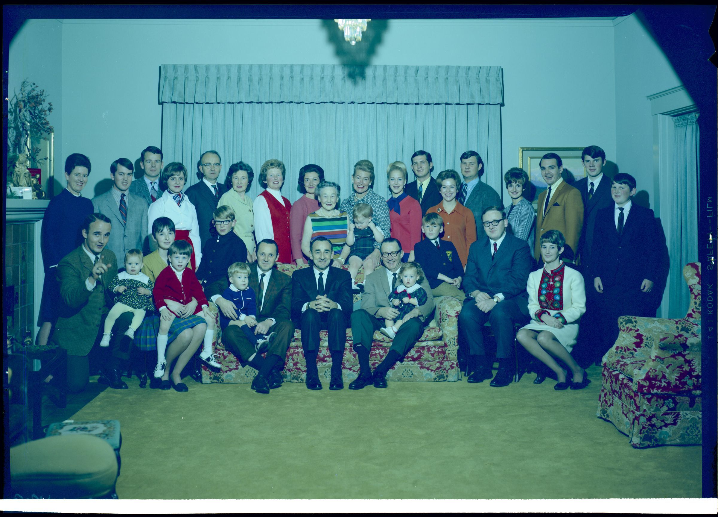 Negative, sheet film. 5 x 7 color. No. W529. Mrs. Adolph Schmidt. Family in color. Received 09/17/1969. Seated on couch: Skip, Bink, Bobby. In center: Winifred.