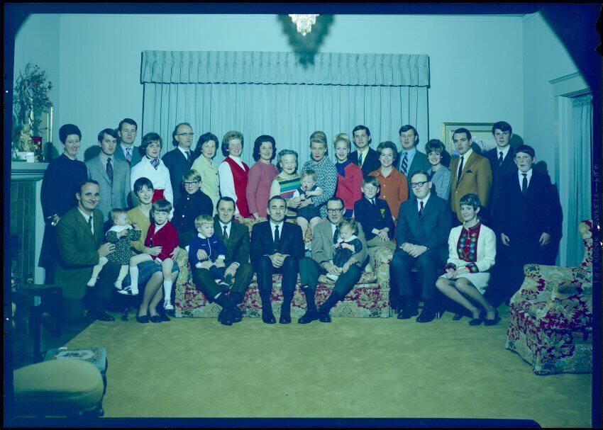Negative, sheet film. 5 x 7 color. No. W529. Mrs. Adolph Schmidt. Family in color. Received 09/17/1969. Seated on couch: Skip, Bink, Bobby. In center: Winifred.