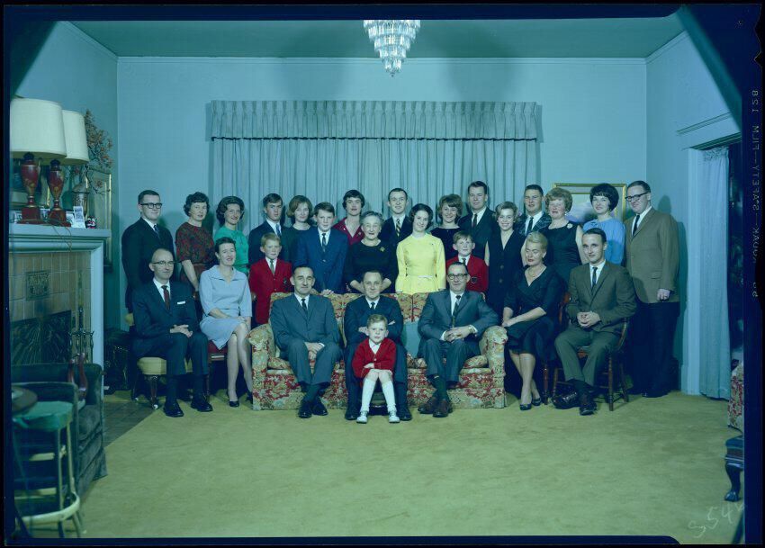 Negative, sheet film. 5 x 7 b&w. No. S546. Mrs. Adolph Schmidt. Christmas picture. On couch, left to right: Bink, Skip, Bobby. Center: Winifred.
