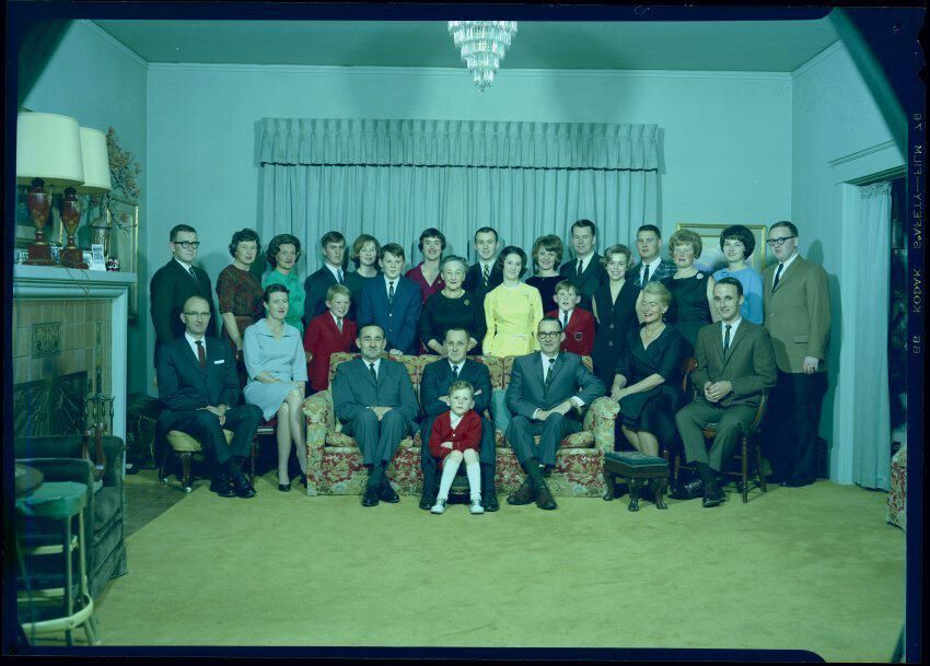 Negative, sheet film. 5 x 7 b&w. No. S546. Mrs. Adolph Schmidt. Christmas picture. On couch, left to right: Bink, Skip, Bobby. Center: Winifred.