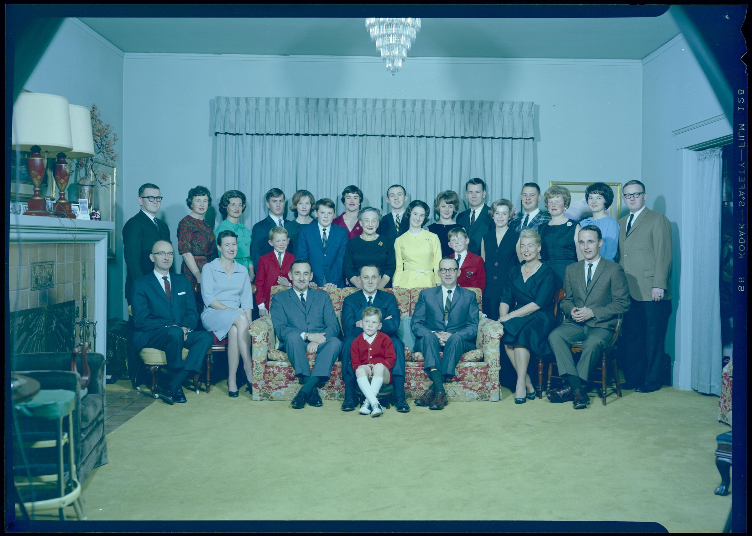 Negative, sheet film. 5 x 7 b&w. No. S546. Mrs. Adolph Schmidt. Christmas picture. On couch, left to right: Bink, Skip, Bobby. Center: Winifred.