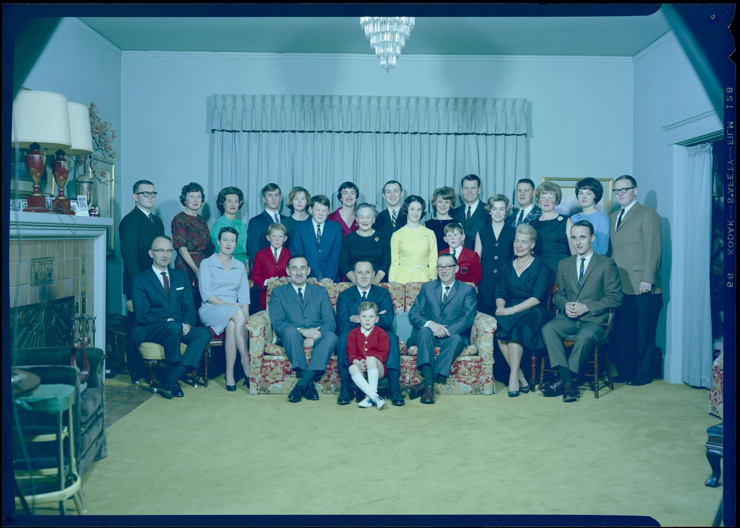Negative, sheet film. 5 x 7 b&w. No. S546. Mrs. Adolph Schmidt. Christmas picture. On couch, left to right: Bink, Skip, Bobby. Center: Winifred.