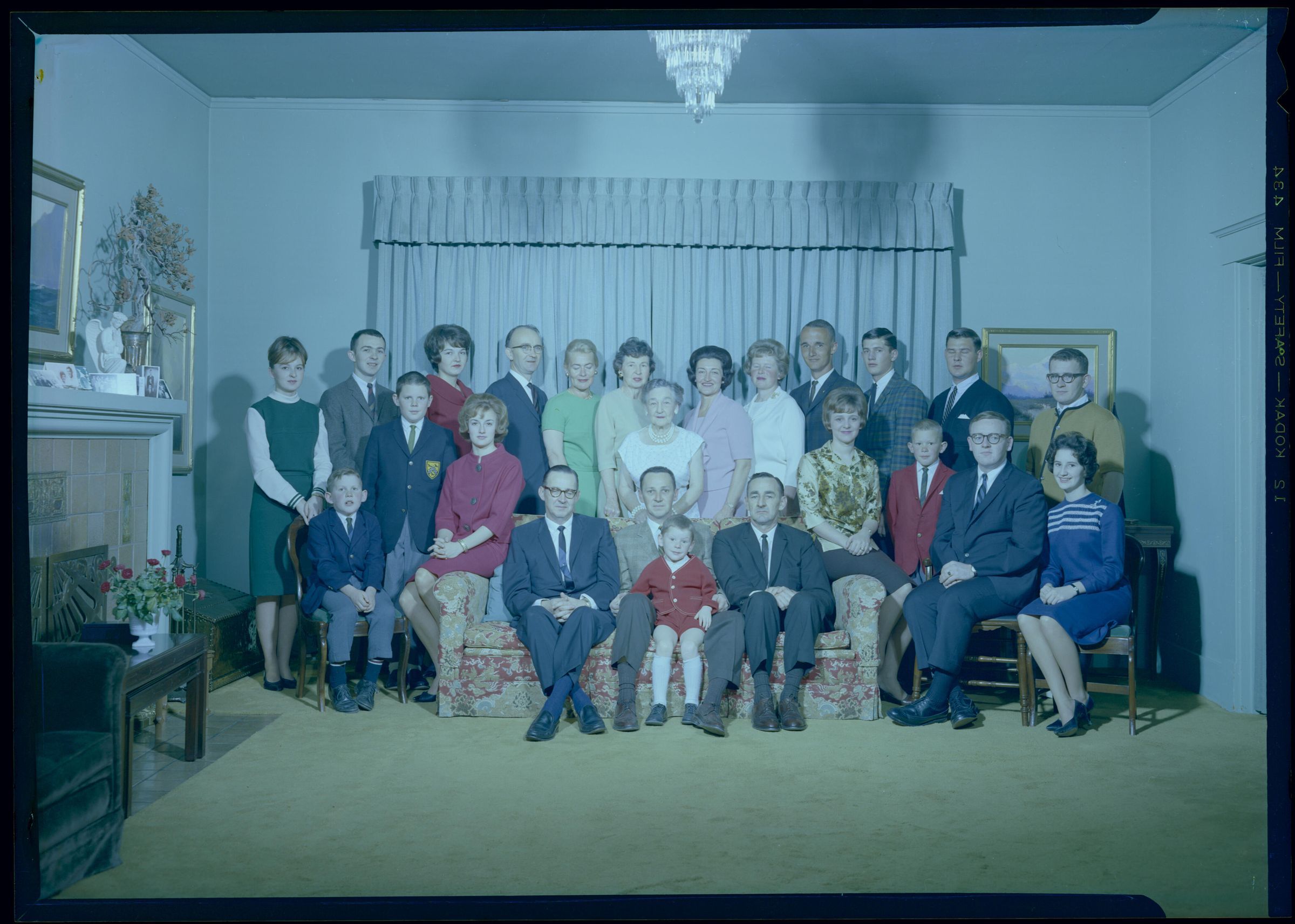 Negative, sheet film. 5 x 7 color. No. S1. Mrs. Adolph Schmidt. Christmas picture. 1963 picture made 01/01/1964. Left to right on couch: Bobby, Skip, Bink. Center: Winifred.