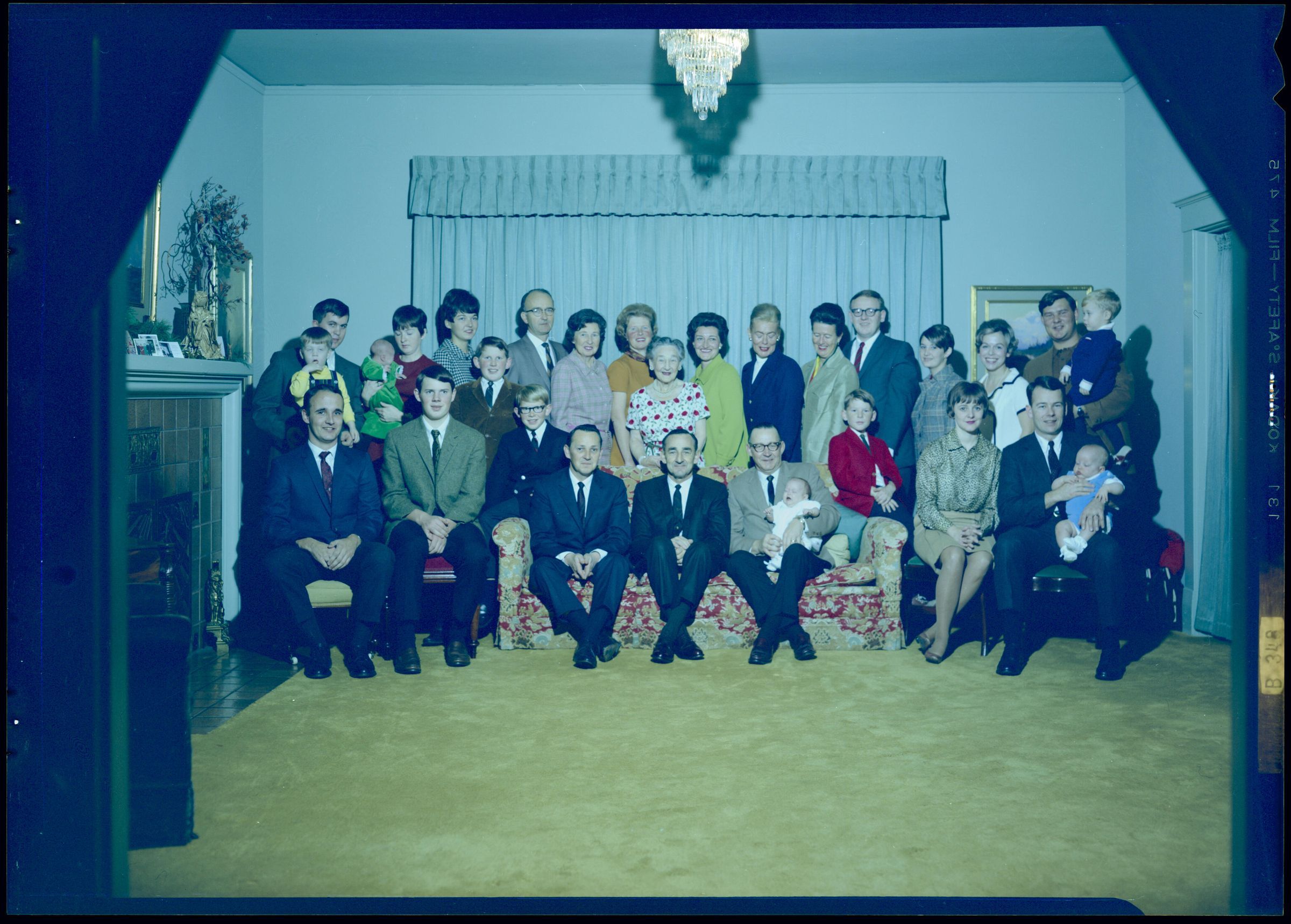 Negative, sheet film. 5 x 7 color. No. V586. Mrs. Adolph Schmidt. Family in color at home. Received 08/28/1968, sent to Econo-Color 11/15/1968, received back 11/25/1968. Left to right on couch: Skip, Bink, Bobby. Center: Winifred.Name/Title