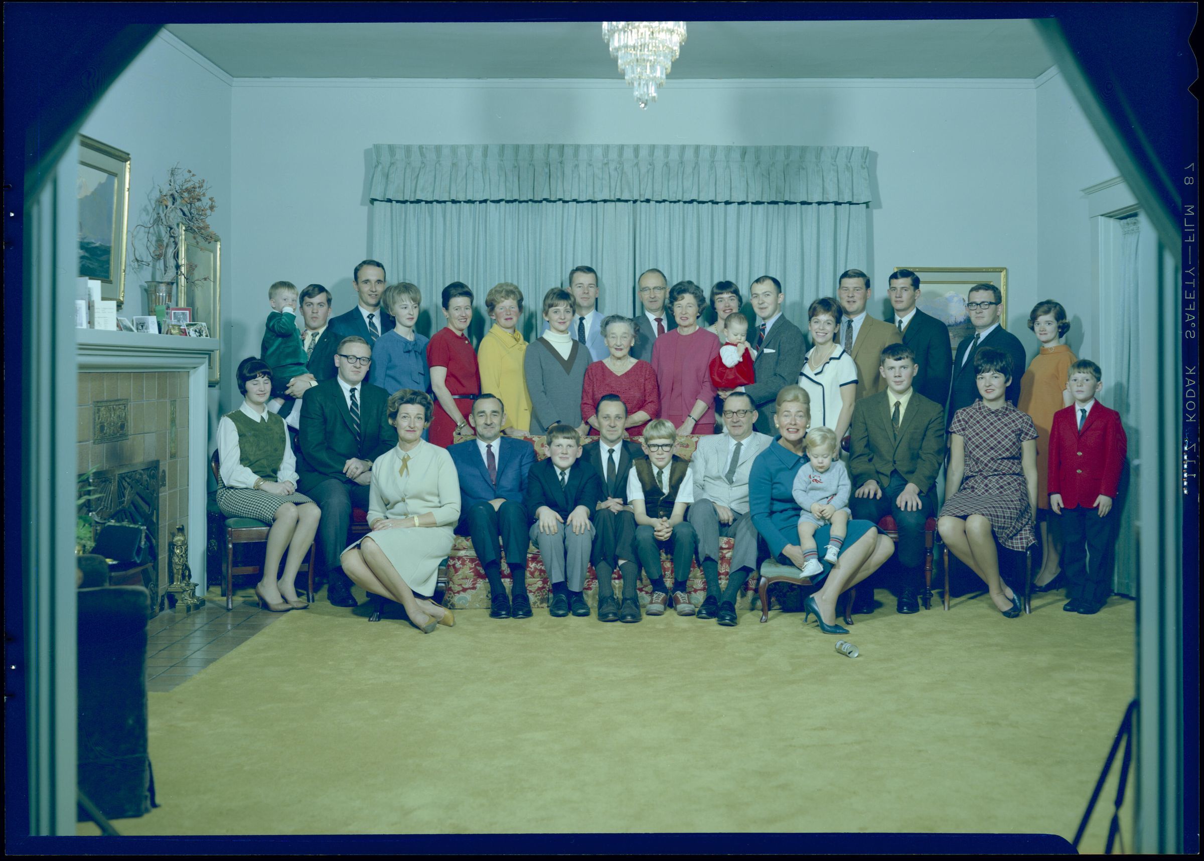 Negative, sheet film. 7 x 2.5 color. No. U549. Mrs. Adolph Schmidt. Family in direct color. Recived 05/19/1967, sent to Econo-Color 10/23/1967. Left to right on couch: Bink, Skip, Bobby. Center: Winifred.Name/Title