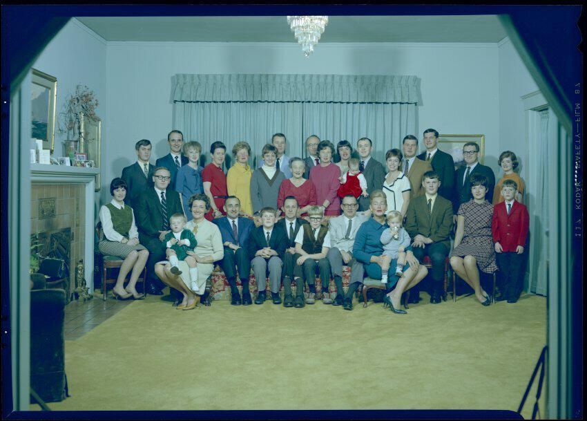 Negative, sheet film. 7 x 2.5 color. No. U549. Mrs. Adolph Schmidt. Family in direct color. Recived 05/19/1967, sent to Econo-Color 10/23/1967. Left to right on couch: Bink, Skip, Bobby. Center standing behind couch: Winifred.Name/Title