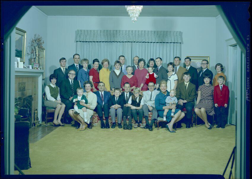 Negative, sheet film. 7 x 2.5 color. No. U549. Mrs. Adolph Schmidt. Family in direct color. Recived 05/19/1967, sent to Econo-Color 10/23/1967. Left to right on couch: Bink, Skip, Bobby. Center standing behind couch: Winifred.Name/Title