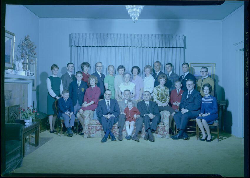 Negative, sheet film. 5 x 7 color. No. S1. Mrs. Adolph Schmidt. Christmas picture. 1963 picture made 01/01/1964. Left to right on couch: Bobby, Skip, Bink. Center: Winifred.