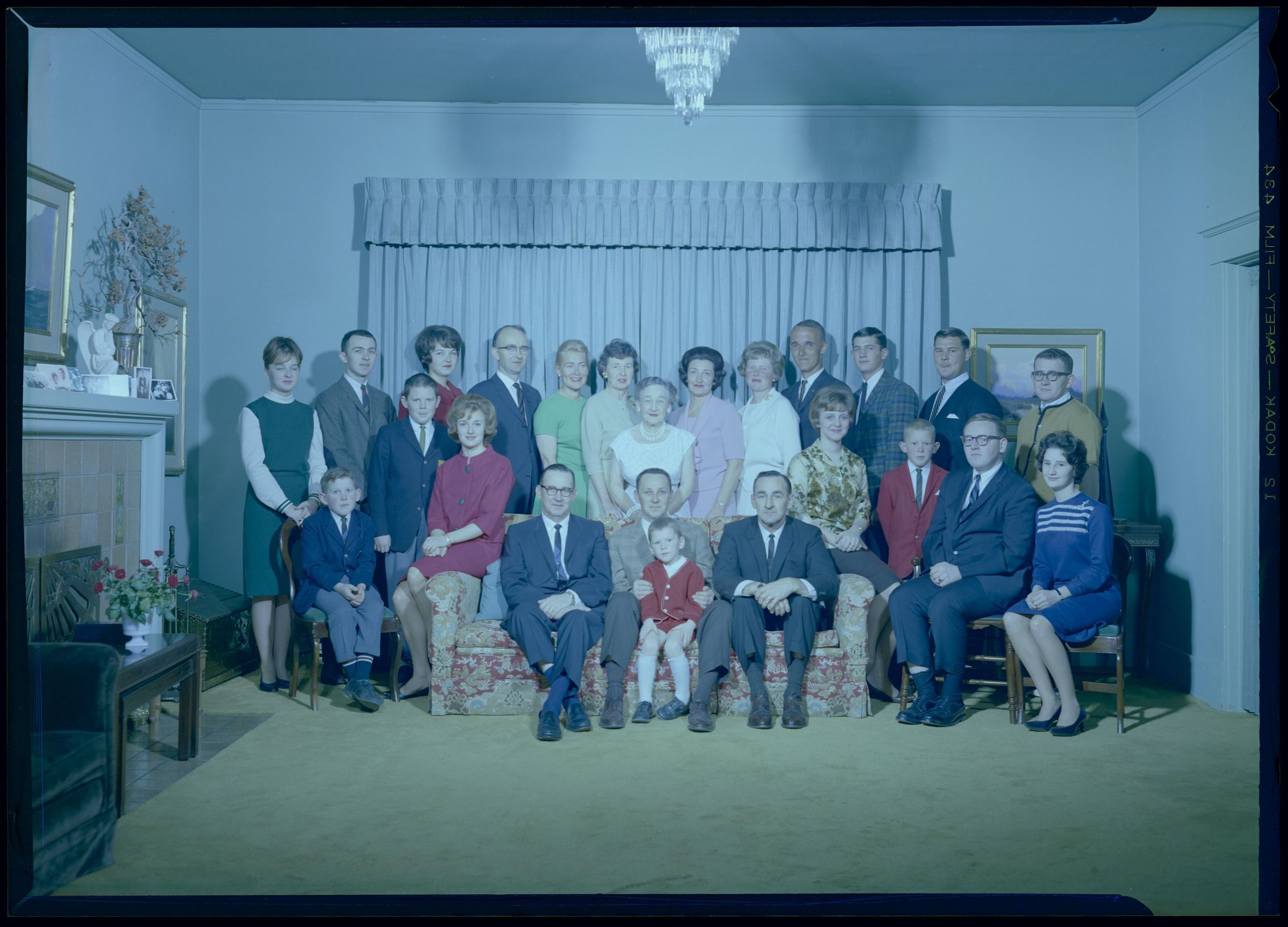 Negative, sheet film. 5 x 7 color. No. S1. Mrs. Adolph Schmidt. Christmas picture. 1963 picture made 01/01/1964. Left to right on couch: Bobby, Skip, Bink. Center: Winifred.