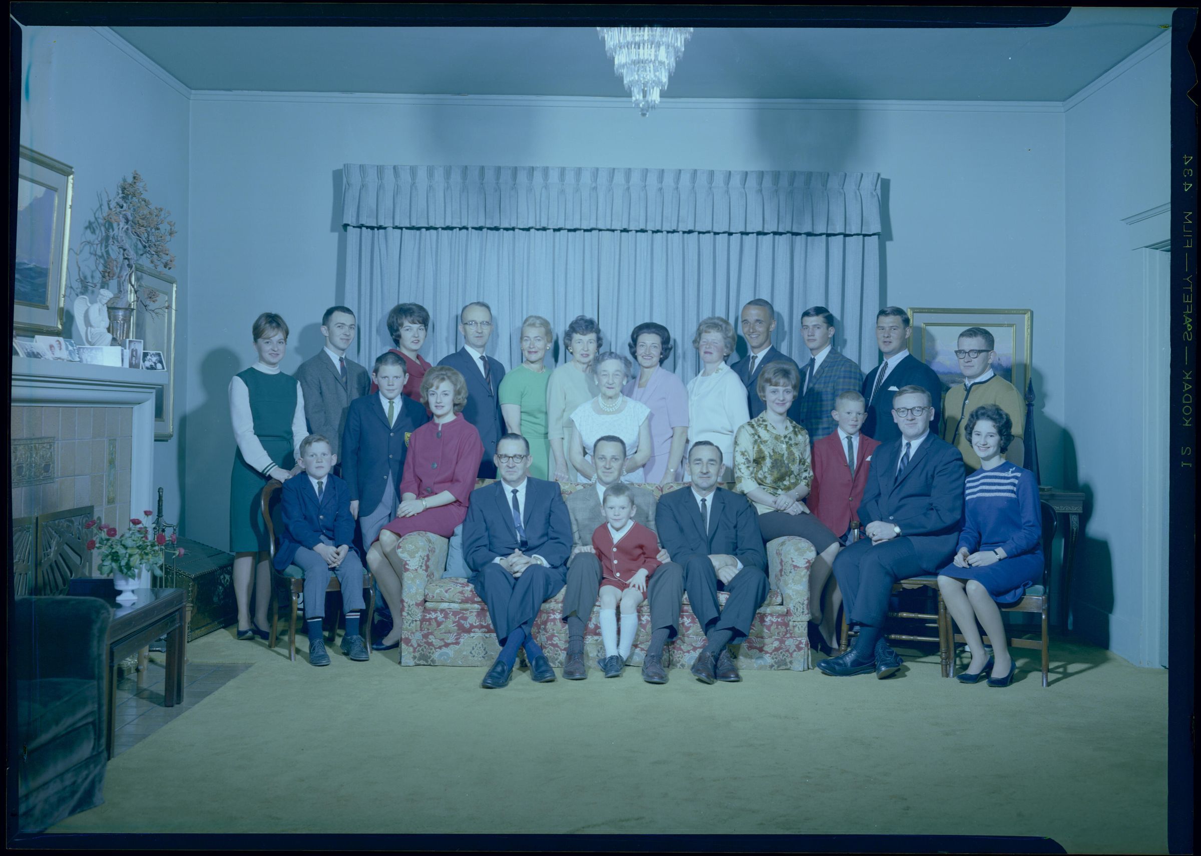 Negative, sheet film. 5 x 7 color. No. S1. Mrs. Adolph Schmidt. Christmas picture. 1963 picture made 01/01/1964. Left to right on couch: Bobby, Skip, Bink. Center: Winifred.