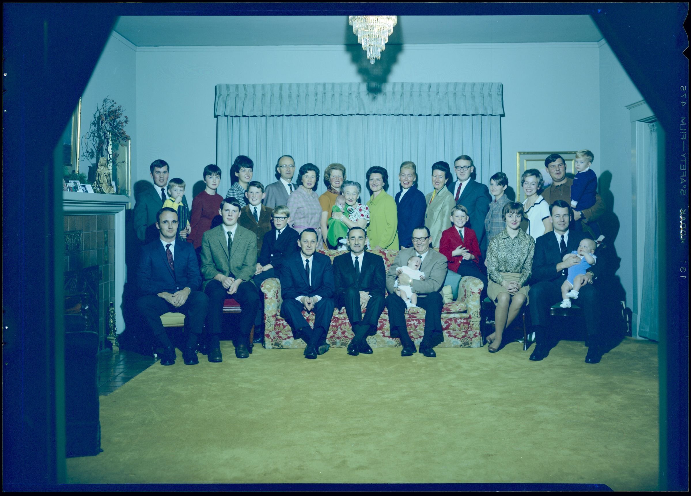 Negative, sheet film. 5 x 7 color. No. V586. Mrs. Adolph Schmidt. Family in color at home. Received 08/28/1968, sent to Econo-Color 11/15/1968, received back 11/25/1968. Left to right on couch: Skip, Bink, Bobby. Center: Winifred.Name/Title