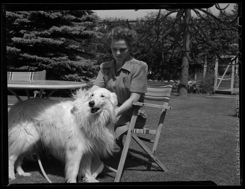 Negative, sheet film. 4 x 3 b&w. No. 4613. Alice Uddy (Oodie) Schmidt. In yard of Schmidt House, with family dog.