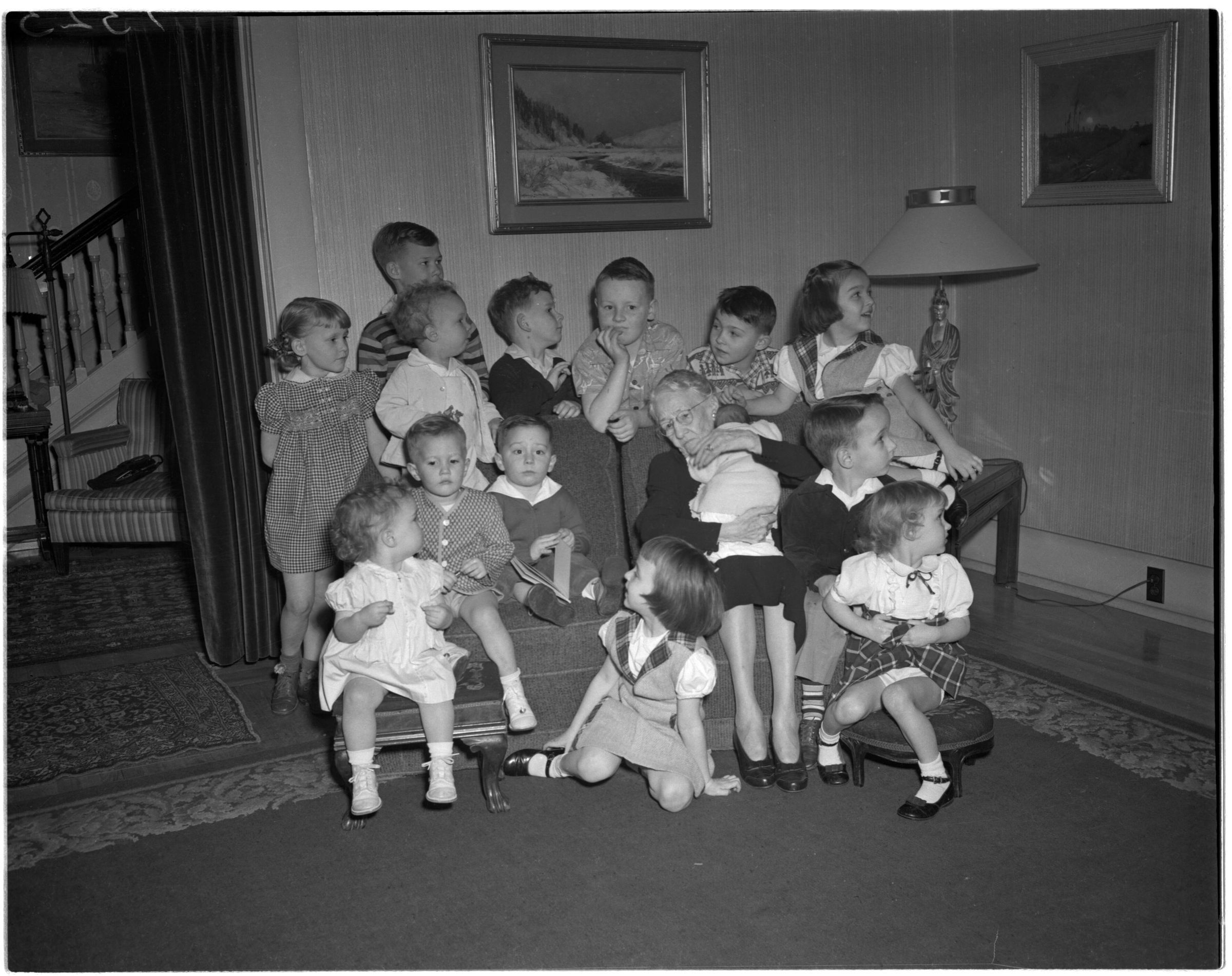 Negative, sheet film. 4 x 5 b&w. No. 2654. Mrs. Adolph Schmidt. Family group. No ID on children, but all are grandchildren of Winifred Schmidt. No ID on elderly woman.