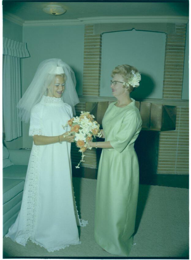 Negative, sheet film. 3.25 x 2.25 color. No. W315. Mr. and Mrs. Frank Schmidt. Color wedding. Received 03/26/1969, sent to M & L 04/03/1969. Wedding of Frank Schmidt and Susan Backman, August 17, 1968. Kathryn Backman at right.Name/Title