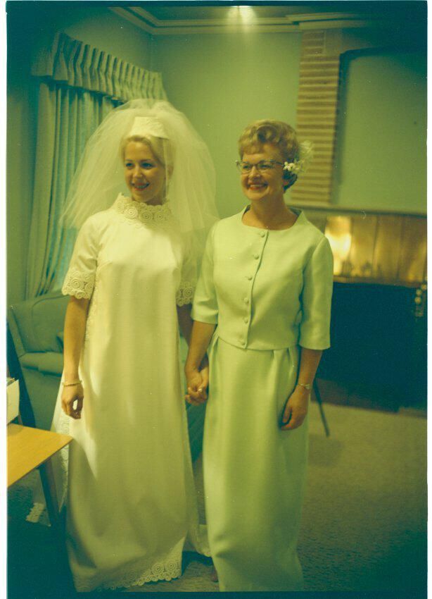 Negative, sheet film. 3.25 x 2.25 color. No. W315. Mr. and Mrs. Frank Schmidt. Color wedding. Received 03/26/1969, sent to M & L 04/03/1969. Wedding of Frank Schmidt and Susan Backman, August 17, 1968. Kathryn Backman on right.Name/Title