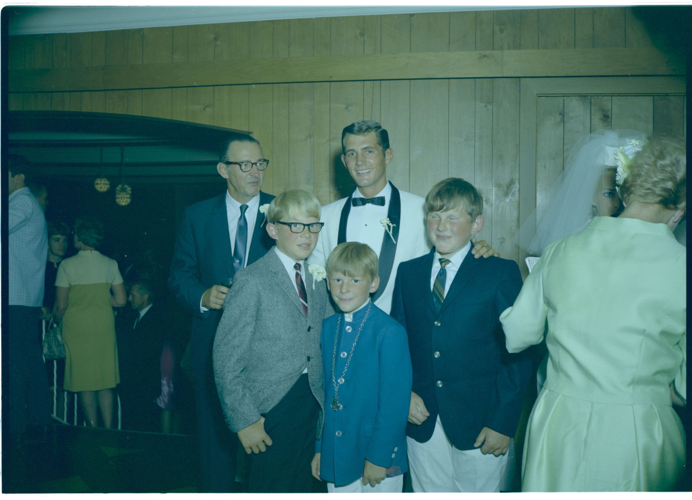Negative, sheet film. 3.25 x 2.25 color. No. W315. Mr. and Mrs. Frank Schmidt. Color wedding. Received 03/26/1969, sent to M & L 04/03/1969. Bobby Schmidt in blue suit. Wedding of Frank Schmidt and Susan Backman, August 17, 1968.Name/Title