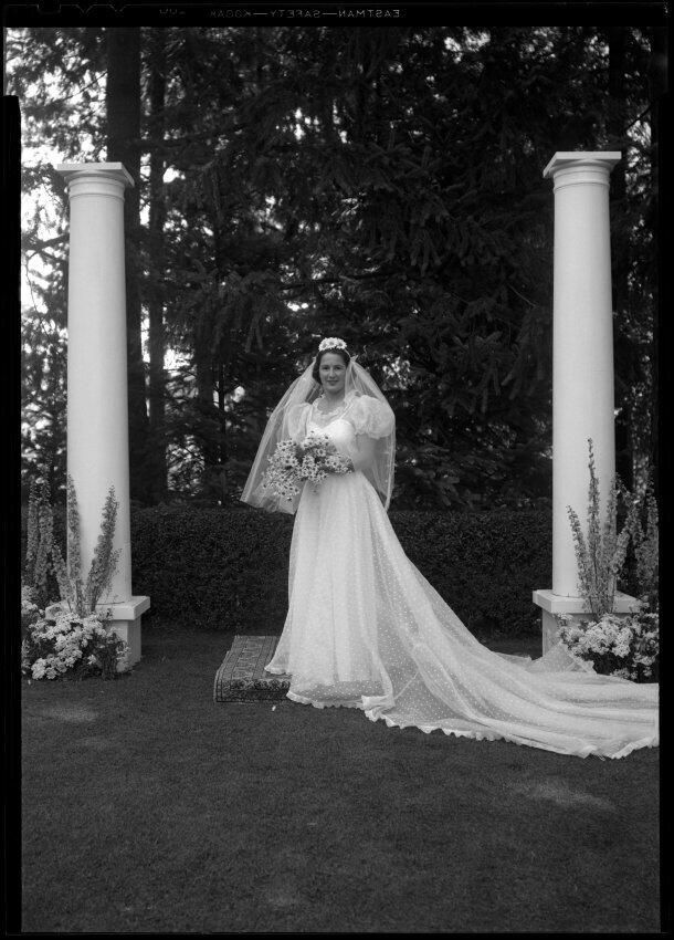 Negative, sheet film. 5 x 7 b&w. No. 4612. Mrs. Edward Allen Stookey nee Margaret Gradie Schmidt. Wedding on July 8, 1939 at Schmidt House.