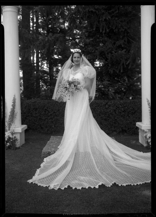 Negative, sheet film. 5 x 7 b&w. No. 4612. Mrs. Edward Allen Stookey nee Margaret Gradie Schmidt. Wedding on July 8, 1939 at Schmidt House.