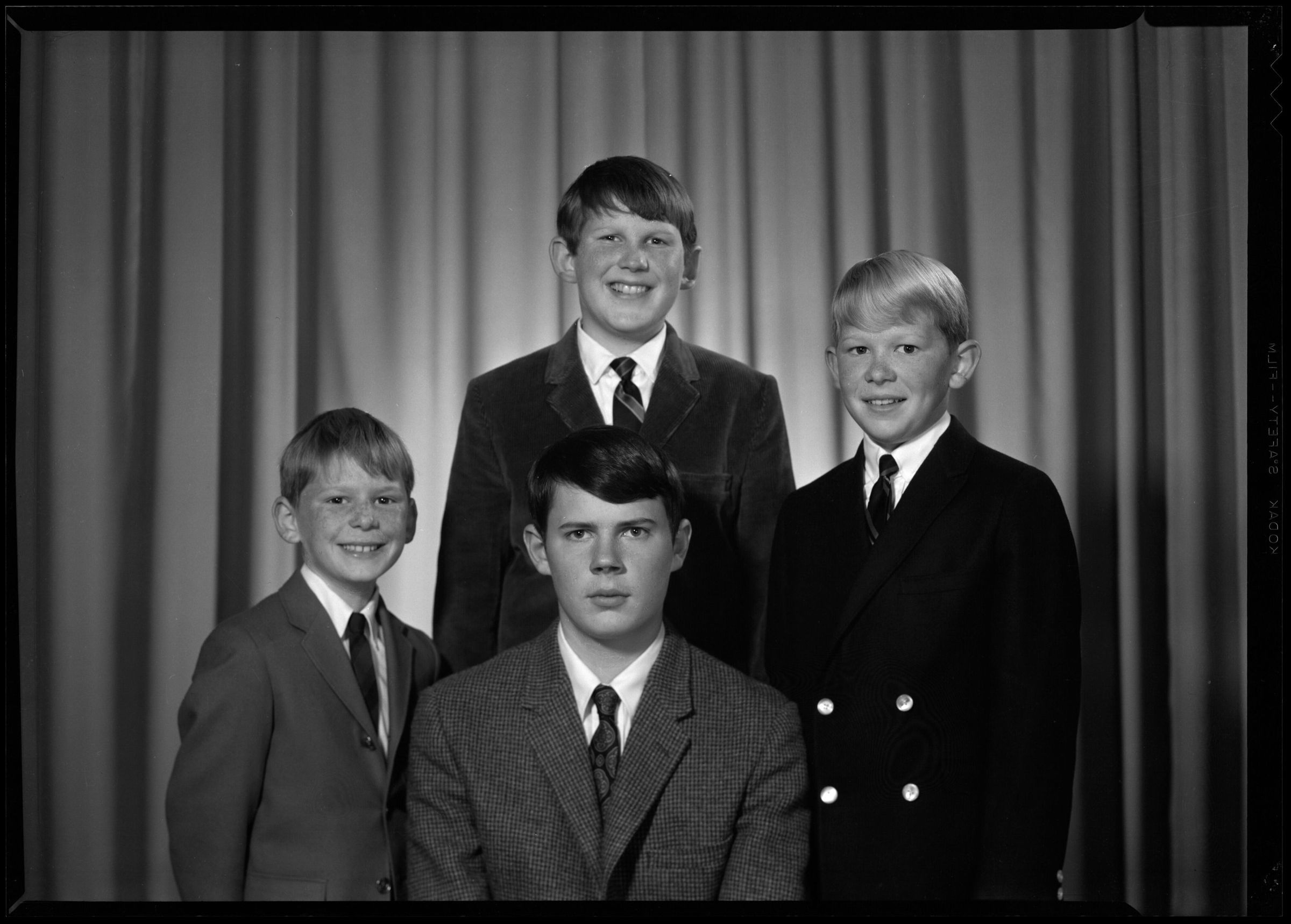 Negative, sheet film. 5 x 7 b&w. No. V524. Sons of Philip Skip and Ruth Schmidt. Back: Dan. Front: Karl, Hank, Spiff.