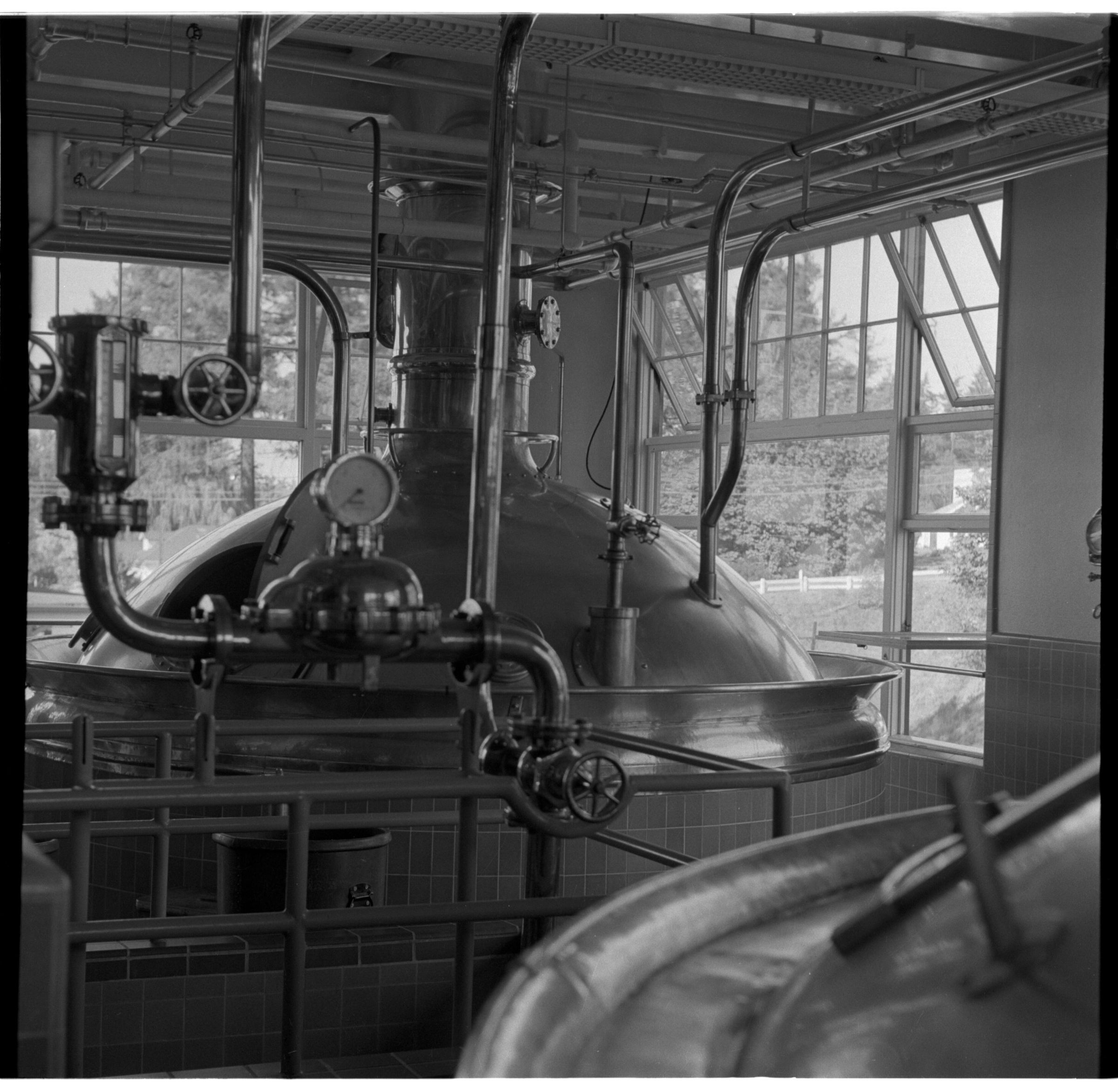 Negative, sheet film. 2.25 x 2.25 b&w. Brew kettles at A brewhouse at Olympia brewery.
