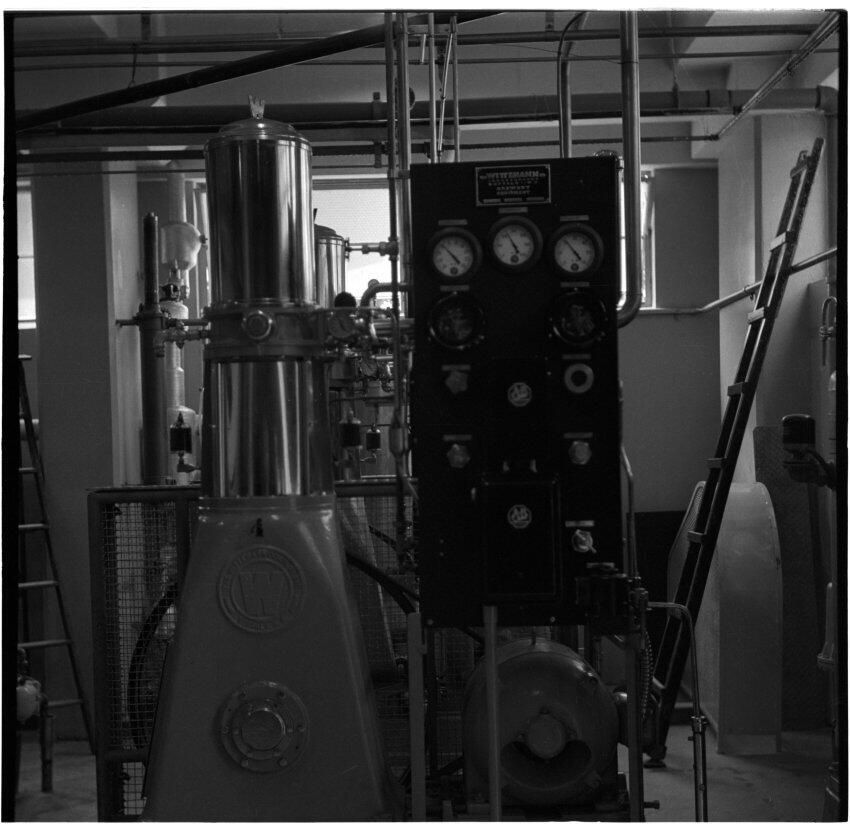 Negative, sheet film. 2.25 x 2.25 b&w. CO2 compressor at brewery in M-1 cellar. The brewery had at least 16 of these compressors. When the CO2 is compressed, it cools, and turns to liquid as it approaches 0 degrees. CO2 was stored as liquid rather than as gas.Name/Title
