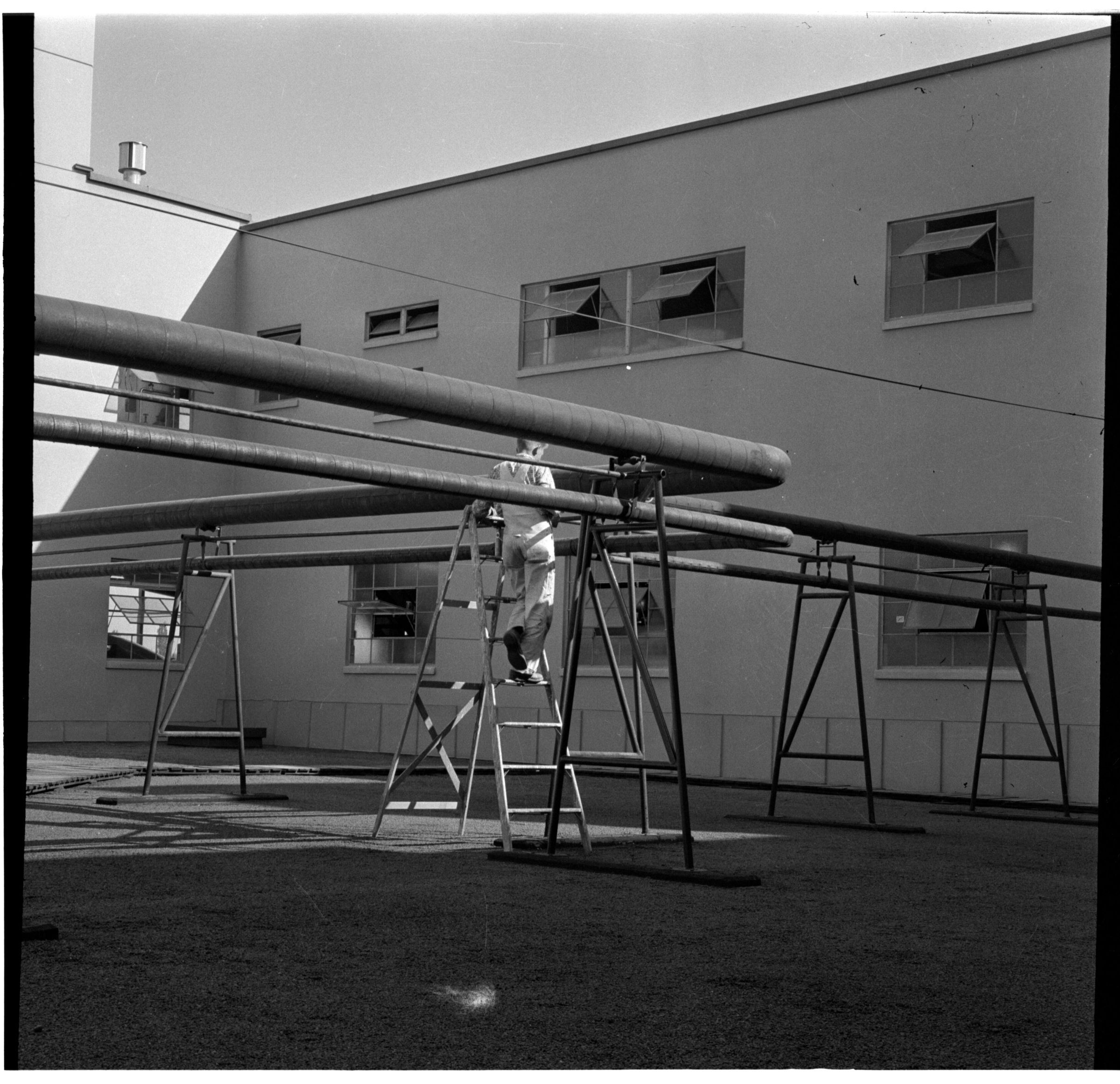 Negative, sheet film. 2.25 x 2.25 b&w. Maintenance man patching insulation on pipes or maybe painting.