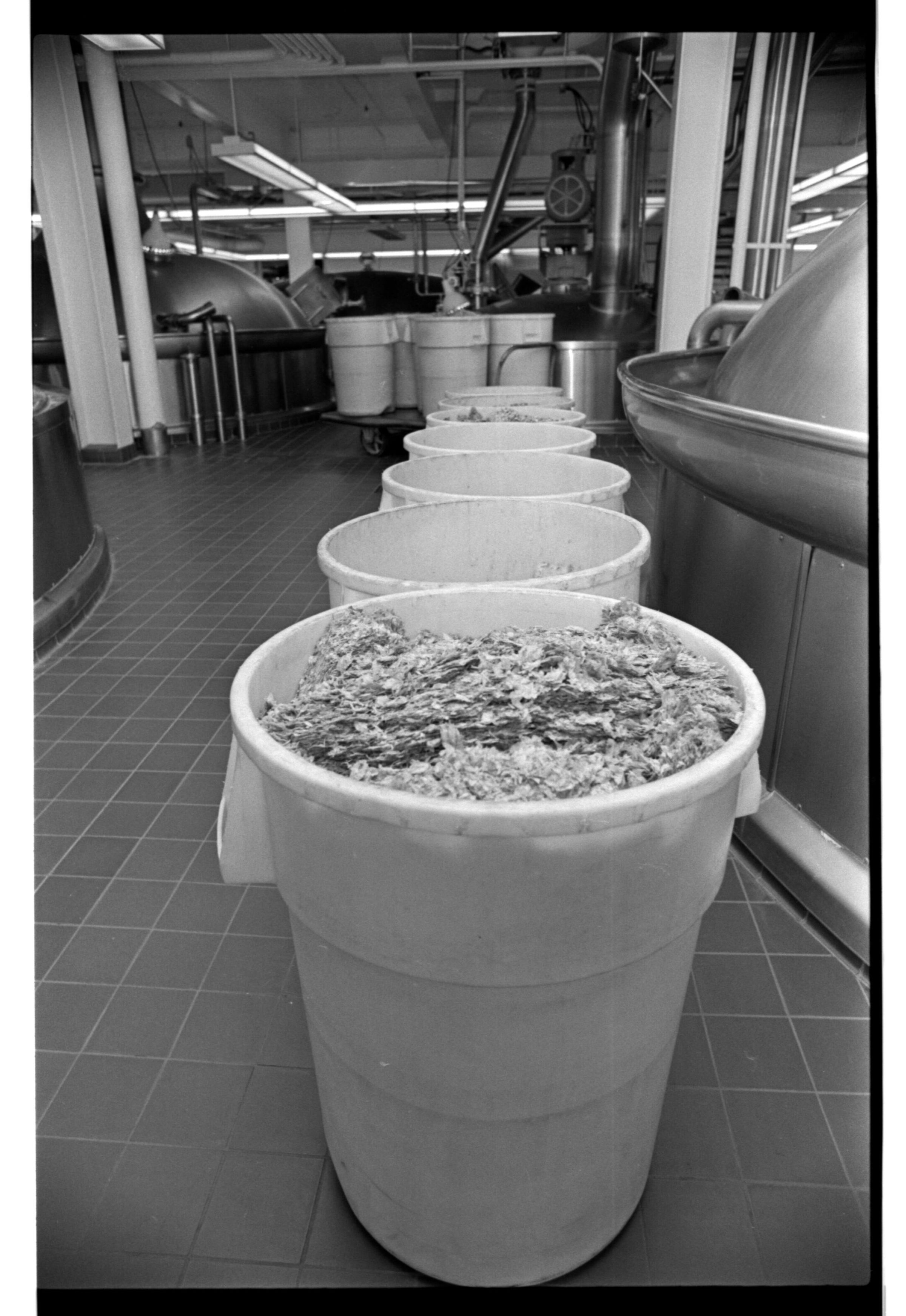 Negative, sheet film. 1.5 x 1 b&w. Brewing floor at Oly brewery. Tubs of hops waiting to be added to C kettle. B brewhouse in background.