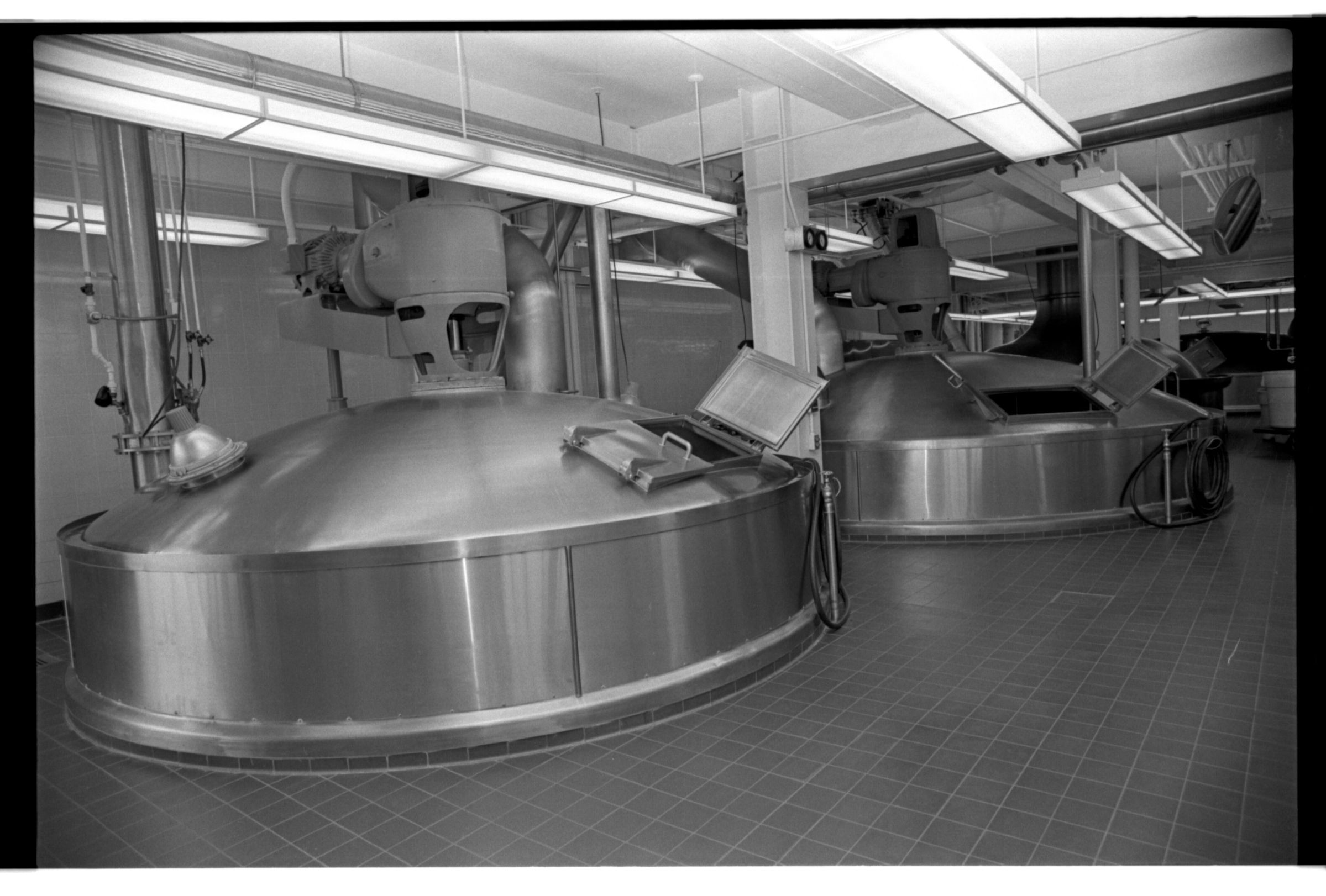 Negative, sheet film. 1 x 1.5 b&w. Mash tub on right and cooker on left at Oly brewery.