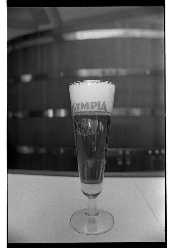 Negative, sheet film. 1 x 1.5 b&w. Glass of beer in Hospitality Room. Wood in background is paneling made from real wood tanks used in early brewery. Wood was upcycled when metal tanks were installed. The bulk of the wood tanks were sold to Nalley's pickle factory in Tacoma.Name/Title