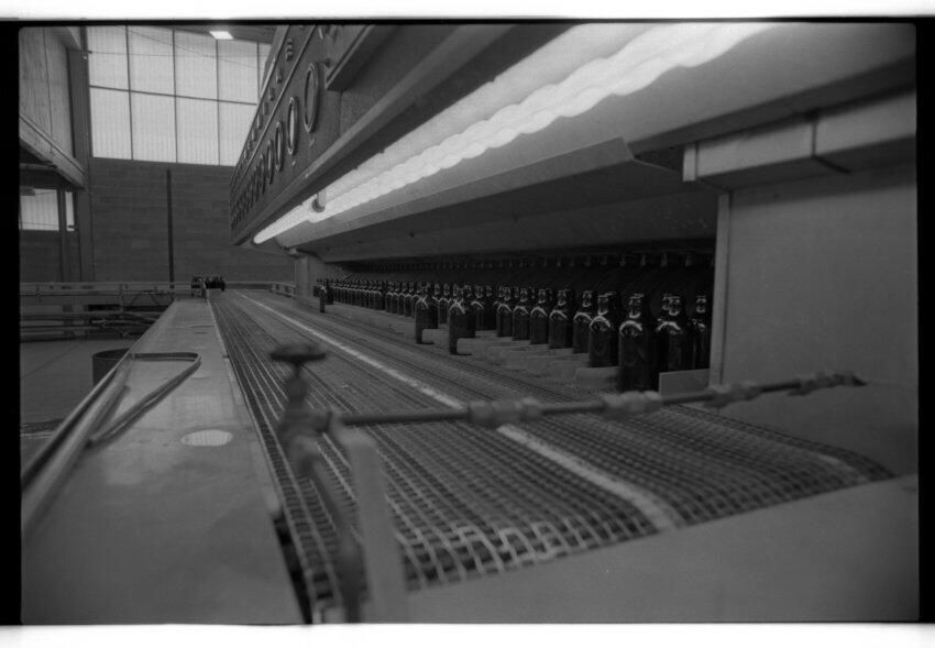 Negative, sheet film. 1 x 1.5 b&w. Bottles coming out of the rinser at B bottleshop in the valley.