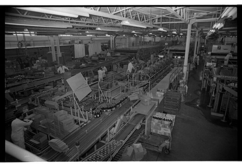 Negative, sheet film. 1 x 1.5 b&w. B bottleshop in the valley. Shows a row of labeling machines for bottles.