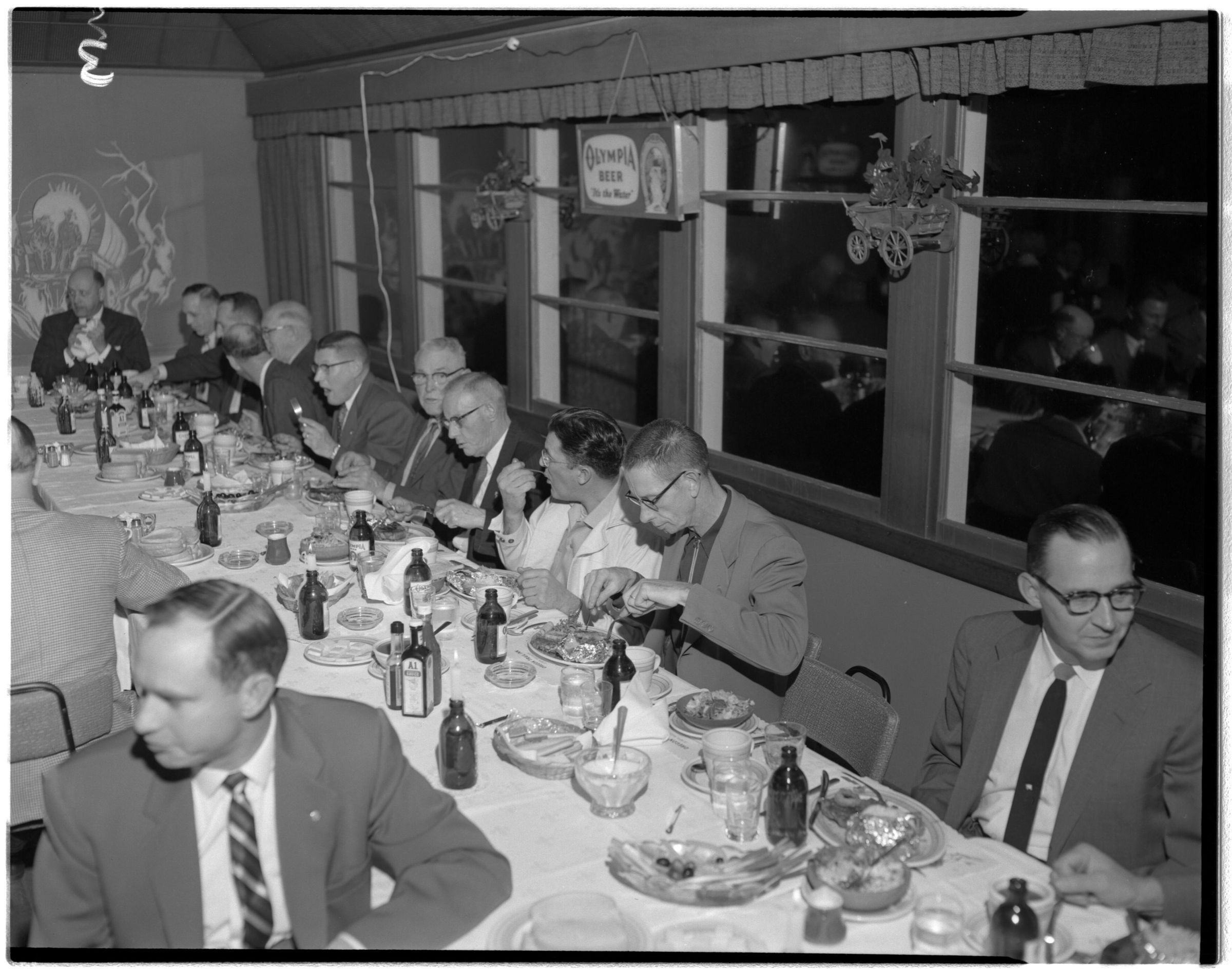 Negative, sheet film. 4 x 5 b&w. Olympia Brewing Company old timers banquet. Retouched 11/21/1959. Bobby Schmidt in right foreground. No ID on others.