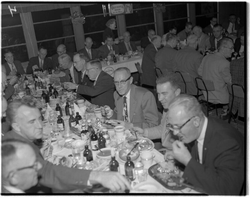 Negative, sheet film. 4 x 5 b&w. Olympia Brewing Company old timers banquet. Retouched 11/21/1959. No ID on people.