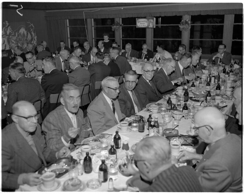 Negative, sheet film. 4 x 5 b&w. Olympia Brewing Company old timers banquet. Retouched 11/21/1959. No ID on people.