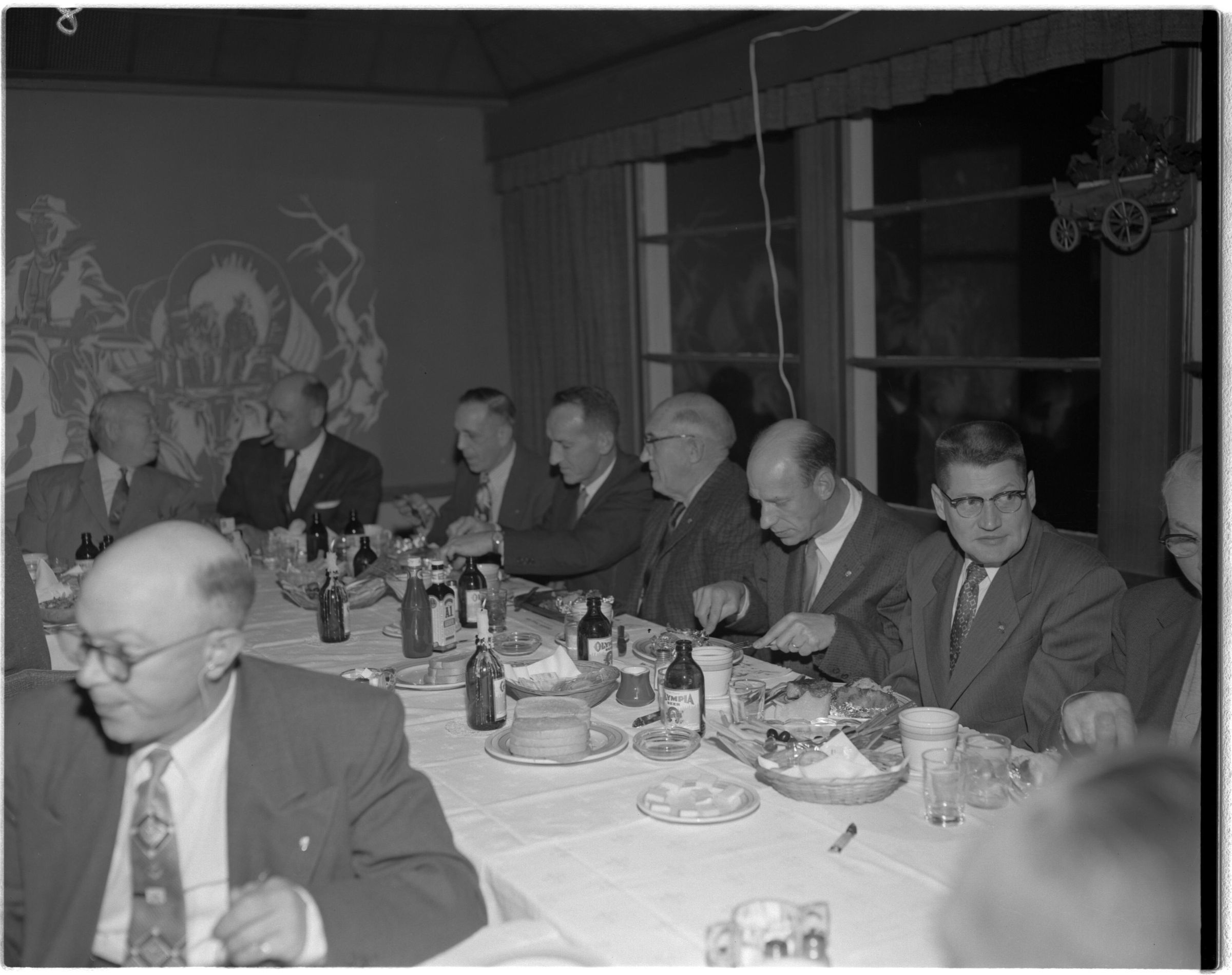 Negative, sheet film. 4 x 5 b&w. Olympia Brewing Company old timers banquet. Retouched 11/21/1959. No ID on people.