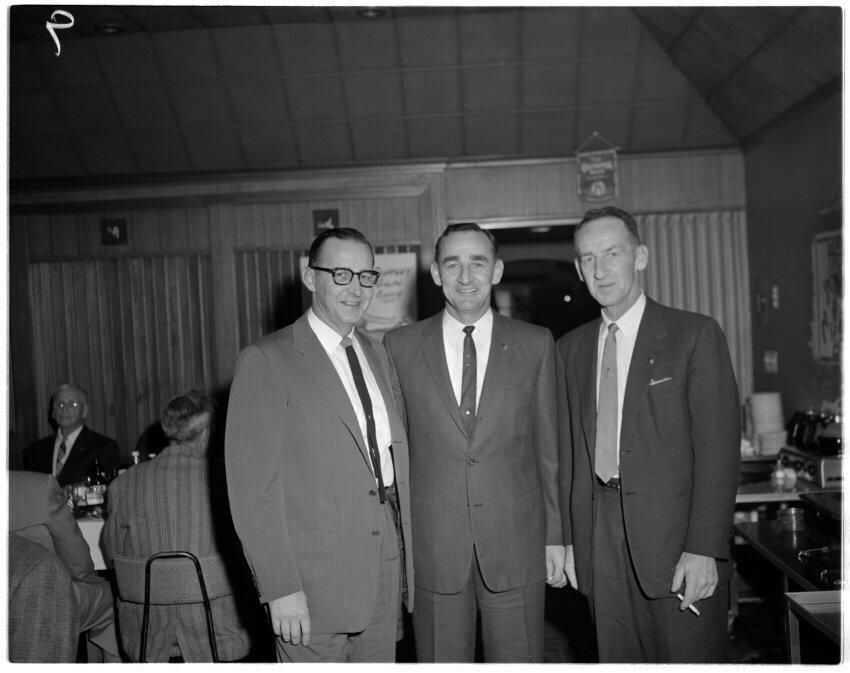 Negative, sheet film. 4 x 5 b&w. Olympia Brewing Company old timers banquet. Retouched 11/21/1959. Bobby, Bink and Bump Schmidt.