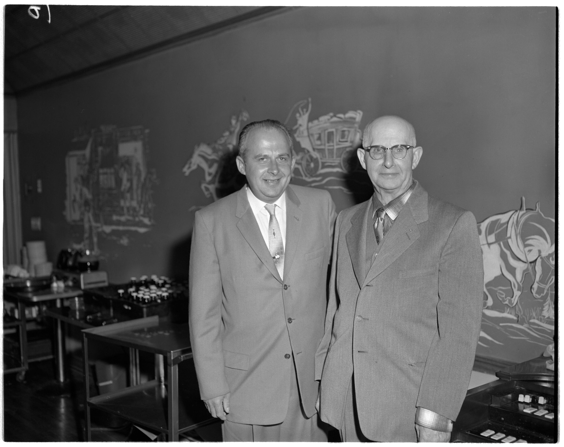 Negative, sheet film. 4 x 5 b&w. Olympia Brewing Company old timers banquet. Retouched 11/21/1959. No ID on people.
