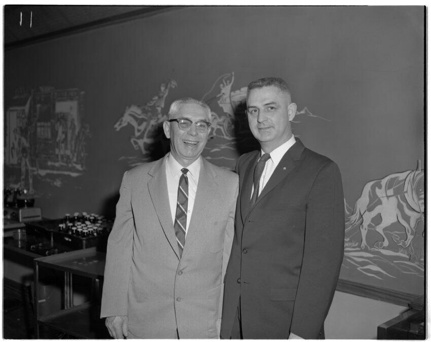 Negative, sheet film. 4 x 5 b&w. Olympia Brewing Company old timers banquet. Retouched 11/21/1959. No ID on people.