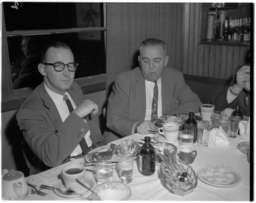 Negative, sheet film. 4 x 5 b&w. Olympia Brewing Company old timers banquet. Retouched 11/21/1959. Bobby Schmidt at left. No ID on others.