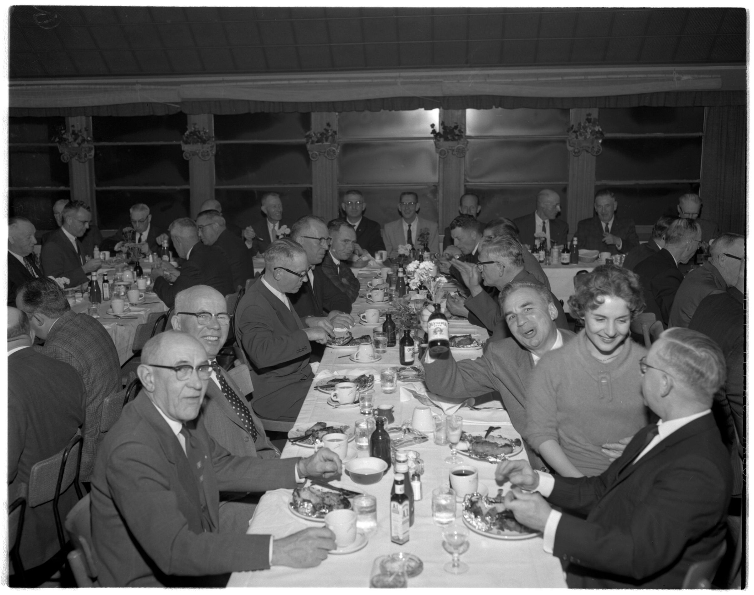 Negative, sheet film. 4 x 5 b&w. No. 3525. Olympia Brewing Company old timers banquet. Retouched 11/21/1959. No ID on people.