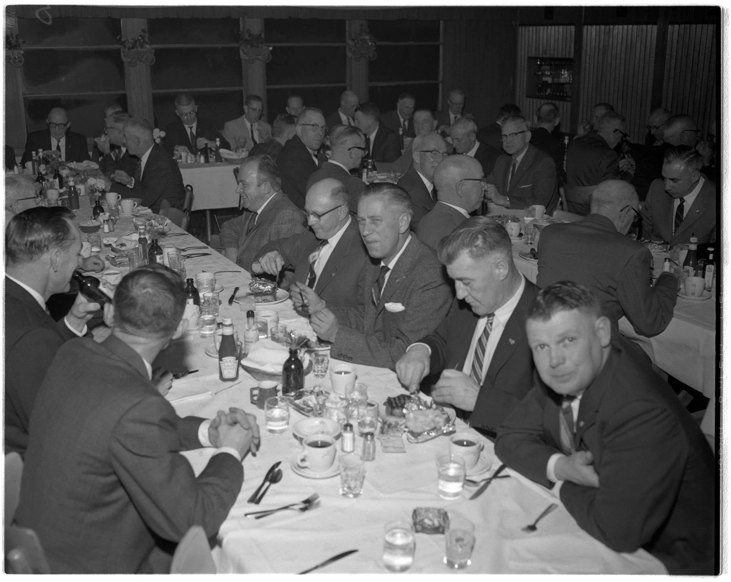 Negative, sheet film. 4 x 5 b&w. No. 3525. Olympia Brewing Company old timers banquet. Retouched 11/21/1959. No ID on people.