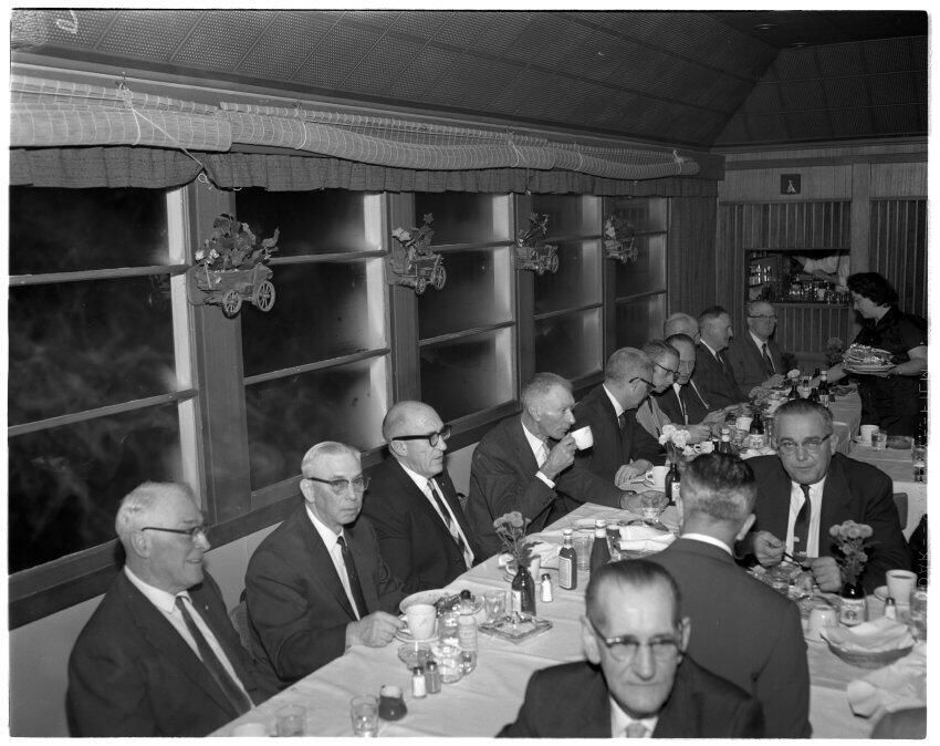 Negative, sheet film. 4 x 5 b&w. No. 3525. Olympia Brewing Company old timers banquet. Retouched 11/21/1959. No ID on people.