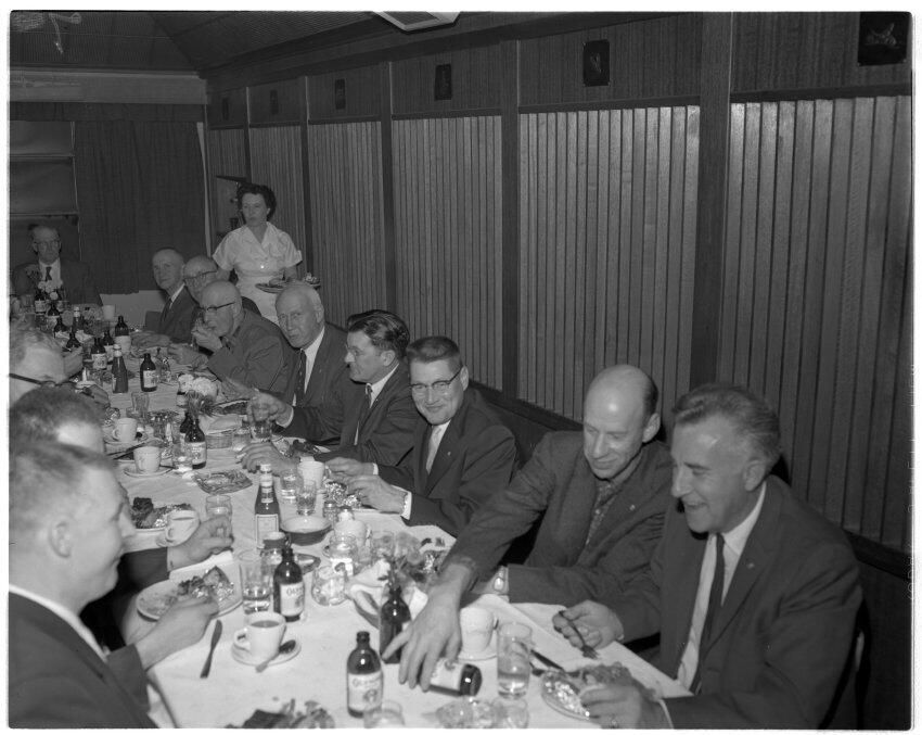 Negative, sheet film. 4 x 5 b&w. No. 3525. Olympia Brewing Company old timers banquet. Retouched 11/21/1959. No ID on people.
